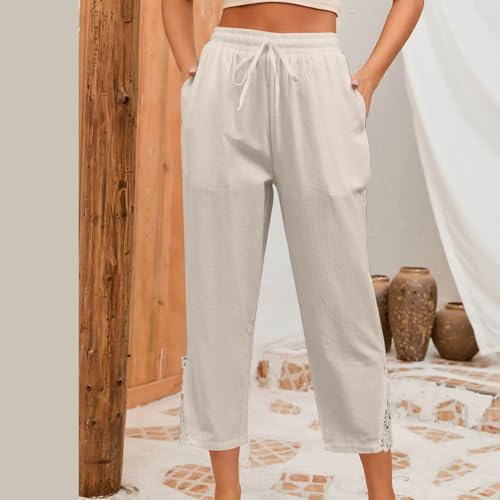 HGps8w Lace Patchwork Linen Pants for Women Elastic Waist Comfy Casual Solid Versatile Loose Work Trousers with Pockets 2