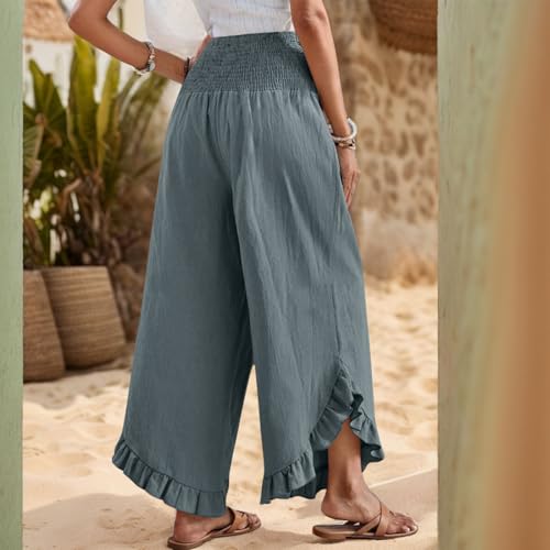 HOT ! Wide Leg Pants Woman Casual Summer Smocked High Waisted Linen Pants Flowy Ruffle Hem Palazzo Pants with Pockets