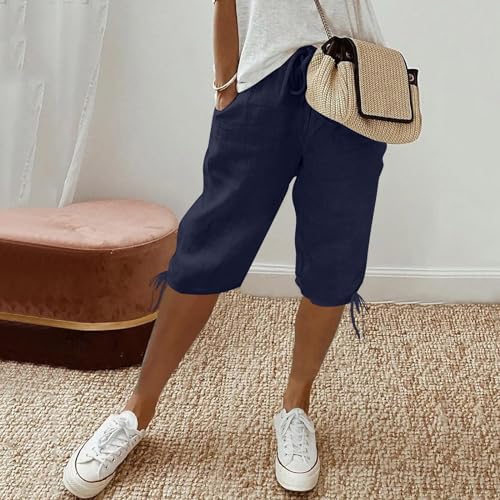 Summer Plus Size Capris for Women Knee Length Cotton Linen Elastic Waist Drawstring Bermuda Shorts with Pockets 6
