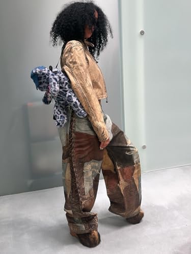 Angsuttc Wide Leg Lounge Pants for Women Color Block Faux Denim 3D Digital Printed Pant Elastic Faux Jean Brown L 1