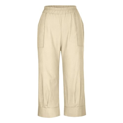 HOT ! Wide Leg Capri Pants Women Petite Length Casual Elastic Waist Cropped Straight Leg Beach Pants Vacation Capris Pocket