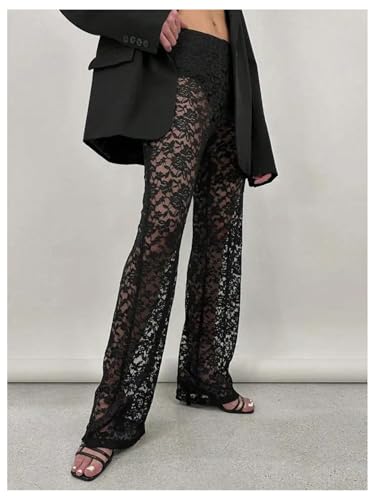 More information about Floerns Women's Lace Sheer Elastic High Waist Bell Bottom See Through Wide Leg Pants