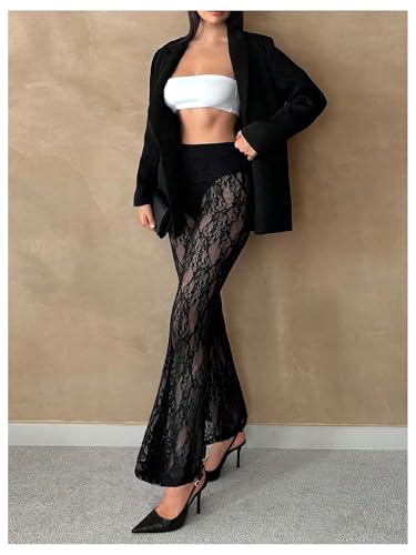 Floerns Women's Lace Sheer Elastic High Waist Bell Bottom See Through Wide Leg Pants 6