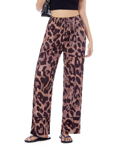 Ladyful Women's Leopard Print Satin Palazzo Pants Wide Leg Elastic Waisted Cheetah Palazzo Going Out Pant Trouser 6
