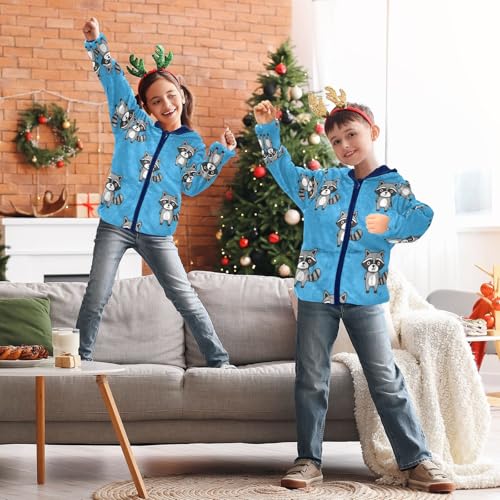 Cute Raccoon Pattern on Blue Toddler Fleece Jacket Girl Boys Hooded Fleece Jacket Coat Warm Outwear Zip-up 3-10T 3