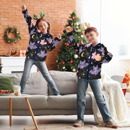HOT ! Cute Bats on Black Background Toddler Fleece Jacket Girl Boys Hooded Fleece Jacket Coat Warm Outwear Zip-up 3-10T