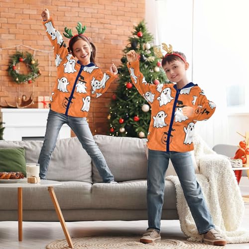 Halloween Ghosts on Orange_1 Toddler Fleece Jacket Girl Boys Hooded Fleece Jacket Coat Warm Outwear Zip-up 3-10T 5