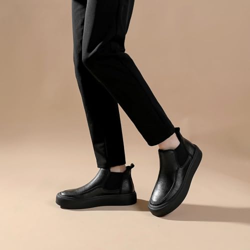 Men's Leather Platform Chelsea Boots Round Toe Comfortable Fur Lined Elastic Slip-On Casual Ankle Boots Mid-Top Business Work Dress Booties 6