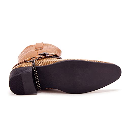 Jazame Cowboy Boots for Men Western Style Ankle High Motorcycle Riding Pointy Toe Moto Dress Boot Belt Buckle Faux Snake Skin Chain Accent 5