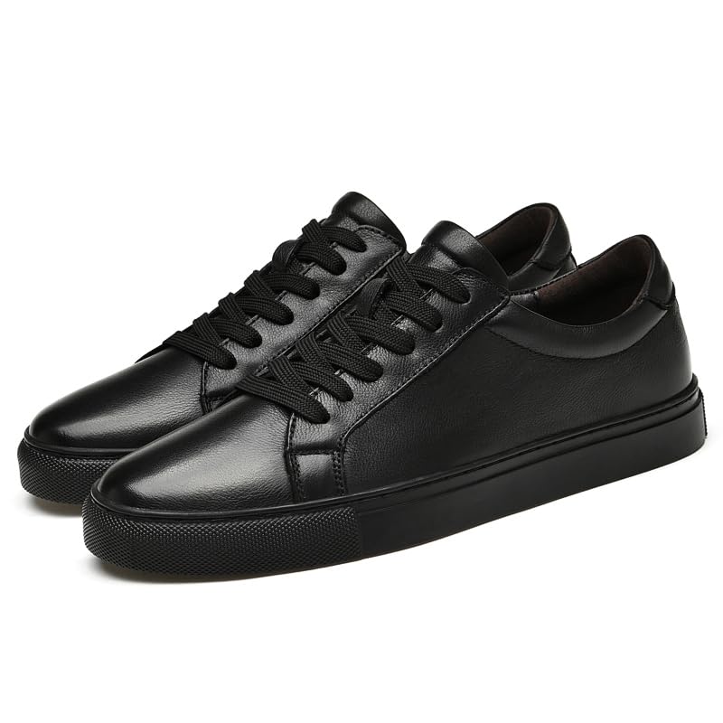 Men's Genuine Leather Sneakers, Casual Flat Skateboarding Shoes, Black, Large Sizes 5