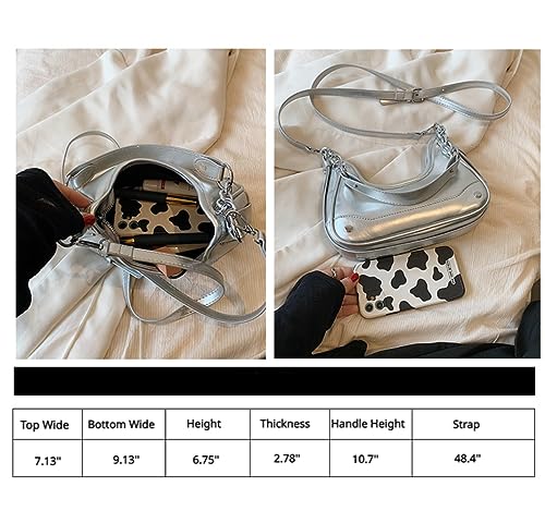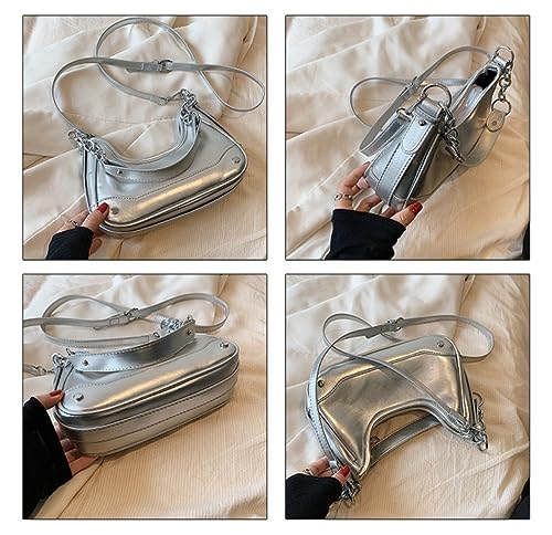 • 【Elevate your style with our Luxury Silver Shoulder Bag】: This sleek and sophisticated bag features a water dumpling shape design, adorned with industrial-inspired metal studs for a touch of edgy glamour. The silver metallic surface combined with the metal chain strap creates a simple yet fashionable look that exudes elegance.
