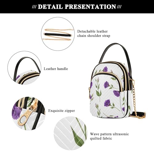 Single Shoulder Purse Women Purple Floral White Quilted Chain Wallet Cell Phone Purse Cute Zipper Crossbody Bowler Bag, 5.9" × 8.3" × 3.1" 2