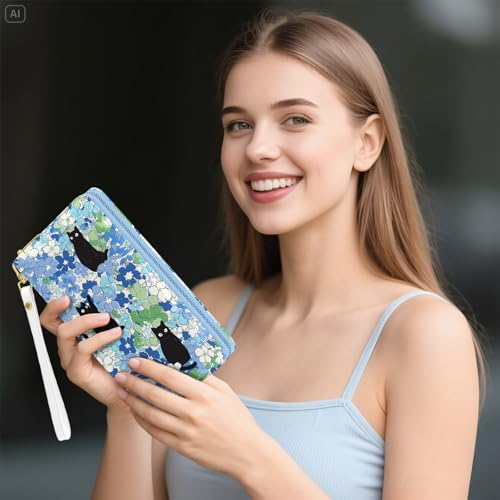 Womens Wallet, Black Cats Wristlet Wallet For Women, Blue Flowers Credit Card Holder Purse With Zipper, Birthday Christmas Graduation Gifts For Women Mom, Travel Office Daily Purse 5