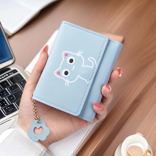 HOT ! Cute Cat Small Wallet Woman with 7 Card Slots and ID Window, Short Woman Wallet Small Kitten Womens Purses with Cat Paw Decoration (Cat, Blue)