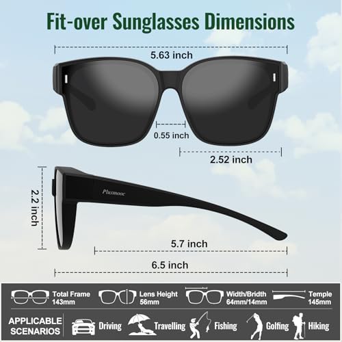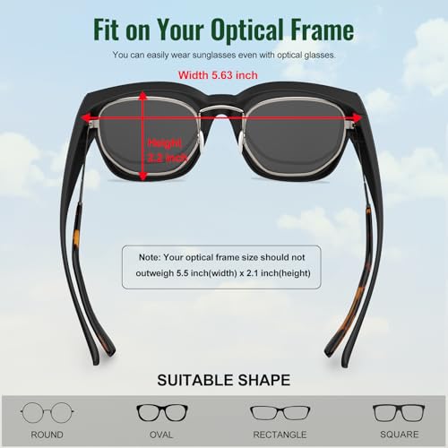 • 【UNISEX CLASSIC STYLISH DESIGN】These prescription sunglasses have a brilliant design, functionally it offers greater coverage can fit and fix firmly with various shapes eyeglasses, The simple yet classic style well attached to all kinds of faces,whether it's worn over your prescription glasses or independently, it makes a versatile accessory to show off your unique temperament. Dimension: width (5.7 inch) *height (1.9 inch),make sure the demension is larger than your eyeglasses frame.