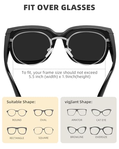 • Over Glasses Sunglasses:Specifically designed for those who wear prescription glasses. Outdoors in strong sunlight allows you to have glasses and sunglasses at the same time. There are grooves on the inside of the temples of the sunglasses to put the glasses in. Large square frames are suitable for most face shapes and glasses shapes. These fit over sunglasses can surely also be worn alone, stylish and practical