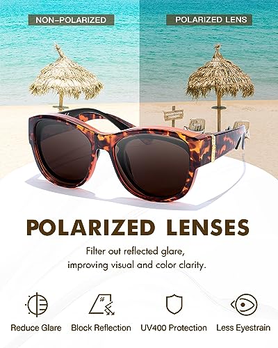• POLARIZED UV400 PROTECTION LENS: Our sunglasses lenses have a polarized coating that provides UV400 protection, reduces glare reflected from highways, bodies of water, snow, and other horizontal surfaces, and alleviates the pain caused by intense light on the eyes. Best for outdoors, driving, and vacation.