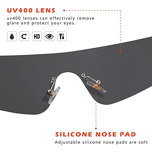 • Futuristic Design: The One-piece silver sunglasses adopts a simple style and frameless colorful mirrored lenses design, it's a strong statement to any outfit. Its flattering lines and aesthetically pleasing appearance capture every angle of your spontaneous personality