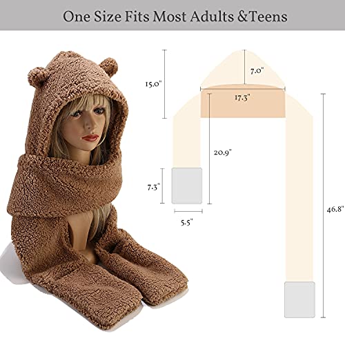 Umeepar Winter Bear Ear Sherpa Hood Hat Scarf Gloves 3 in 1 Hooded Scarf for Women Men 4