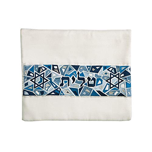 • BEAUTIFUL GEOMETRIC MOTIF EMBROIDERY with Stars of David decorates this Tallit prayer shawl and matching Items. inspired by mosaics and motifs found across the Holy Land. The Tallit Atara is embroidered with the hebrew blessing that is said before wearing the Tallit.