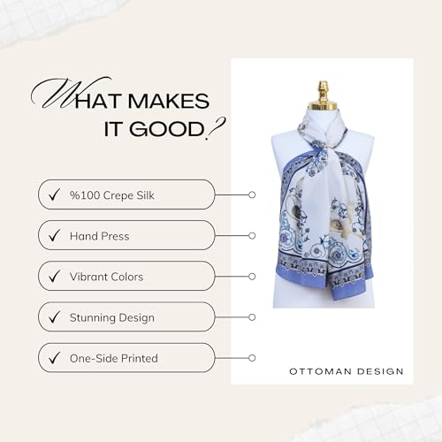 • GORGEOUS DESIGN: Experience the allure of Turkish mosaic large silk scarf artistry with our exquisite Crepe Silk Scarf for hair designs. These creations draw inspiration from the captivating artistry of ancient Turkish and Seljuk civilizations, showcasing the splendid patterns that once adorned palaces and textiles. Single-sided and hand-pressed patterns, each radiating vibrant beauty. Ideal for women fashion of all ages and and season; fall, winter, spring, summer.