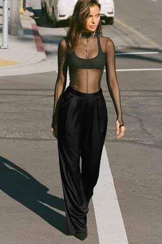 GOKATOSAU Women's Casual Wide Leg Pants High Waist Pleated Satin Straight Long Trousers 6