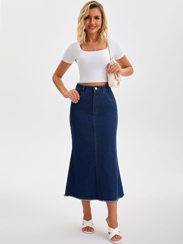 Women Denim Skirt Maxi A Line High Waisted Raw Hem Casual Jean Skirt 5