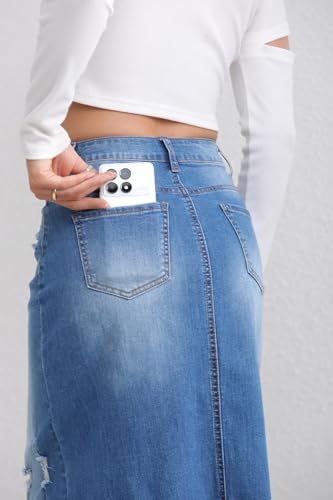 HOT ! Women's High Waisted Long Denim Skirt with Back Slit Distressed Holes Stretch Whisker Wash