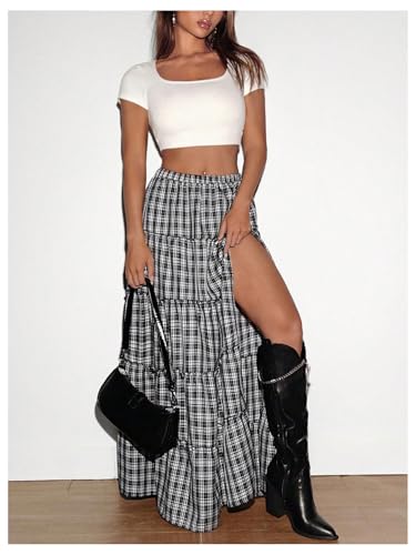 HOT ! Verdusa Women's Ruffle Gingham Plaid Long Skirt Flowy Casual Split Thigh Elastic Waist Maxi Skirts