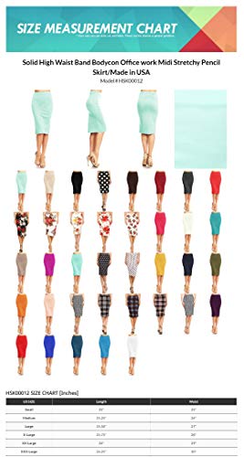 • HSK00024: Solid, high waisted knee length pencil skirt in a fitted style, with an elastic waistband, and ruffle trim accent.