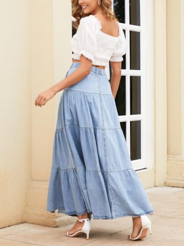 HOT ! ebossy Women's Tiered Button Down Denim Maxi Skirts High Elastic Waist Pleated Swing A-Line Jean Skirts with Pockets