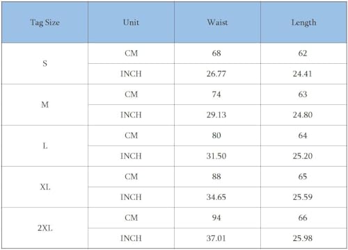 • NOT STANDARD SIZING,please check the size chart at the description page.S: Waist 26.77",Length 24.41";M: Waist 29.13",Length 24.80";L: Waist 31.50",Length 25.20";XL: Waist 34.65",Length 25.59";2XL: Waist 37.01",Length 25.98"