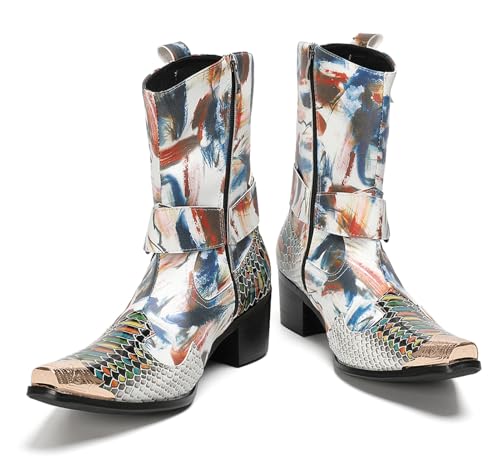 • Head-Turning Western Style,Handmade: Statement paint-stroke print,snakeskin accents,and a gleaming metal toe cap-each pair hand-finished for unique character. These men's cowboy boots command attention at festivals, rodeos, concerts, cosplay, parties, and nights out.