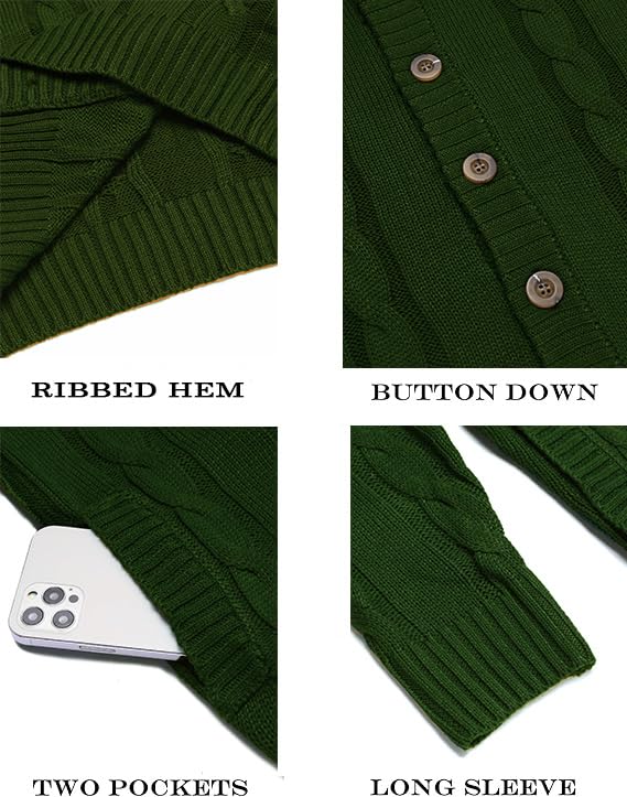 • 【DESIGNED】This cardigan sweater features stand collar, single breasted, twisted cable pattern, two pockets, long sleeve with ribbing at cuffs and hem.