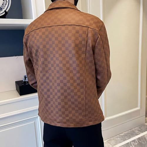 Men's Plaid Leather Jacket Casual Lapel Motorcycle Leathers Coat Classic Button Bomber PU Jackets 5