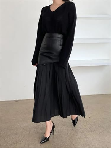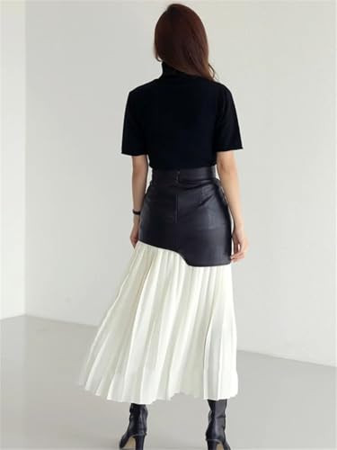 Women's Patchwork Pu Leather Skirt High Waist Midi Folds Color Block Skirts Autumn Fashion Clothing 1