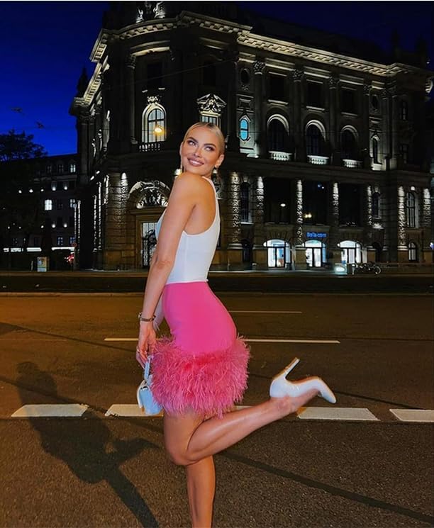 QA-89 Women's Pink Hip Wrapped Skirt with Real Ostrich Feather Hair Spliced Slim Fit Short Mini Skirts 3