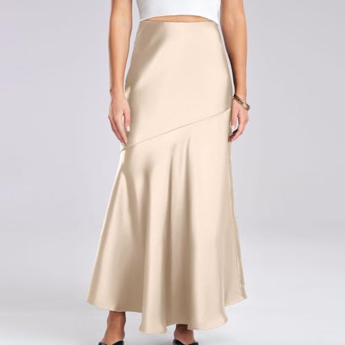 Women's Long Satin Skirt Silk Elegant High Waist Cocktail Party Wedding Flared A-Line Flowy Swing Maxi Skirts 7