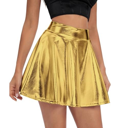 HOT ! Lmdudan 2025 Women's Shiny Flared Pleated Mini Skater Skirt Trendy Elegant Metallic Wet Look Stretchy Flared Skirts