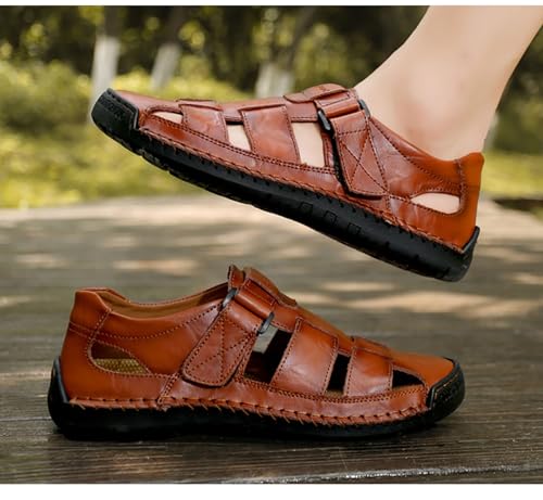 Men's Leather Hollow Out Hook Loop Flat Fisherman Sandals Closed Toe Head Soft Bottom Wading Sandals 7