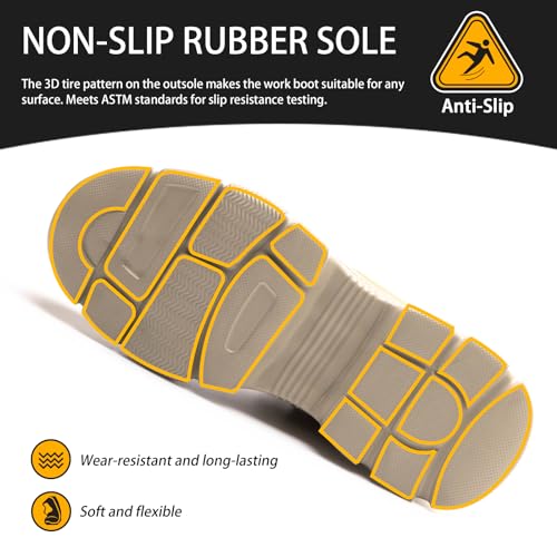 • Anti-Slip: The soles of the high-top steel toe boots are designed with non-skid patterns, and the added deep non-slip grooves greatly enhance the grip of the work boots, effectively guaranteeing your safety when walking on slippery surfaces.