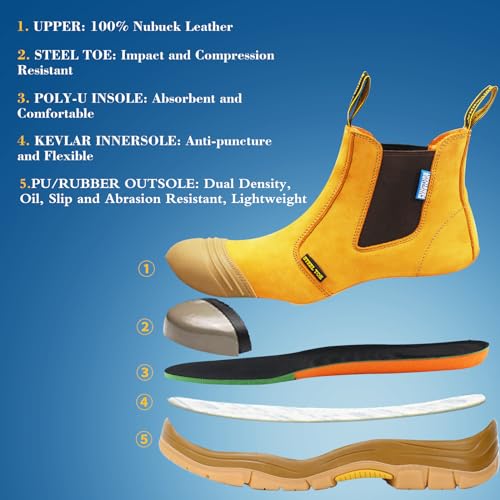 Work Boots for Men, Steel Toe, Puncture-Resistant, Pull on Chelsea Leather Safety Boots, US Size 6-15 M & W 5