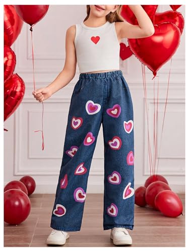 WDIRARA Girl's Heart Print Elastic Waist Jeans Straight Leg Cute Denim Pants 5