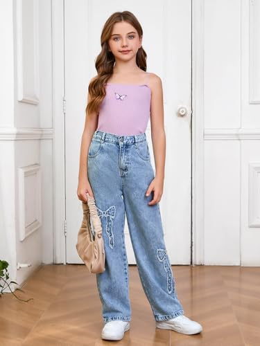 WDIRARA Girl's Bowknot Print Washed Jean Elastic Waist Denim Pants Straight Leg Trousers with Pockets 5
