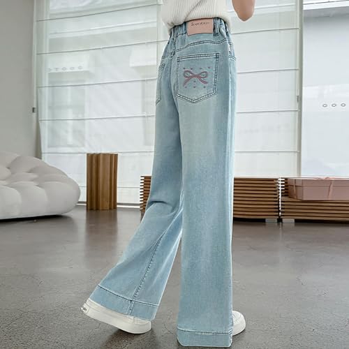 HOT ! Girls Bows Jeans Kids Baggy Wide Leg Denim Pants with Bows Pockets Straight Cute Elastic Trendy Preppy Y2k Trousers