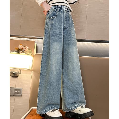 Girls Flare Denim Pants Side Smock Elastic High Waist Baggy Wide Leg Jeans Kids Casuall Trousers 5