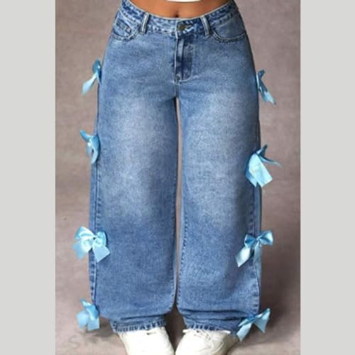 HOT ! Bow Jeans for Woman Teen Girls Baggy Jeans High Waisted Straight Leg Pants