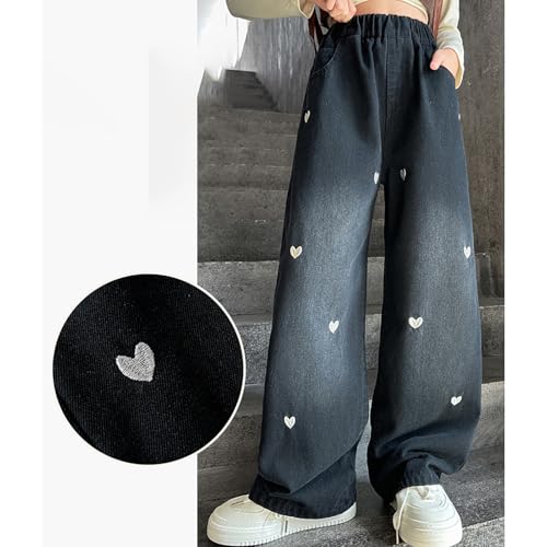 HOT ! Jeans for Girls Baggy Wide Leg Heart Denim Pants Elastic High Waist Cute Trousers Casual Trendy Streetwear with Pockets