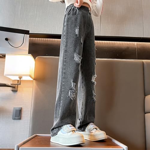 Girls Ripped Jeans Straight Leg Baggy Button Denim Pants Elastic Waist Trousers Casual Trendy Streetwear with Pockets 6
