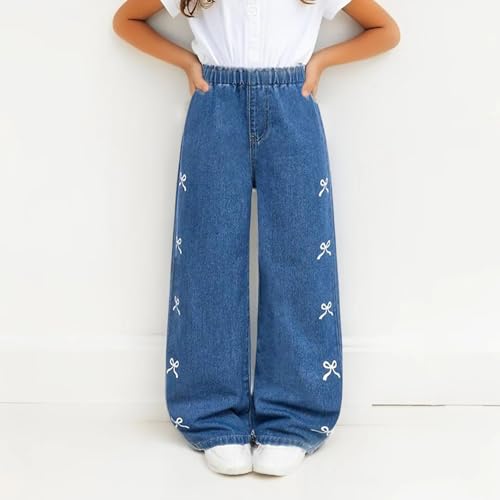 Girls Bowknot Print Baggy Jeans Kids Y2k Jeans Wide Leg Elastic Waist Loose Denim Pants Comfy Cotton Fall Winter 6